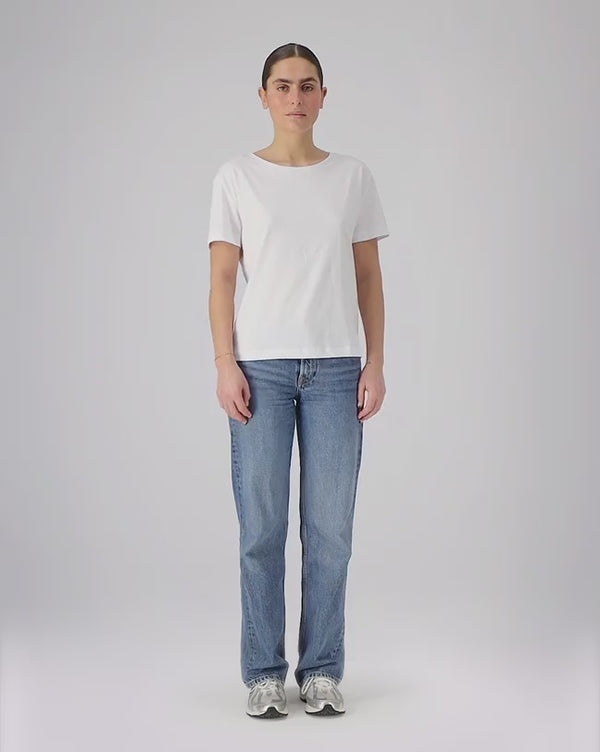 Ein minimalistisches, feminines T-Shirt mit tiefem Ausschnitt, das Komfort mit dezenter Eleganz vereint. Perfekt als Basis für Alltagsoutfits – solo oder unter einem Blazer.