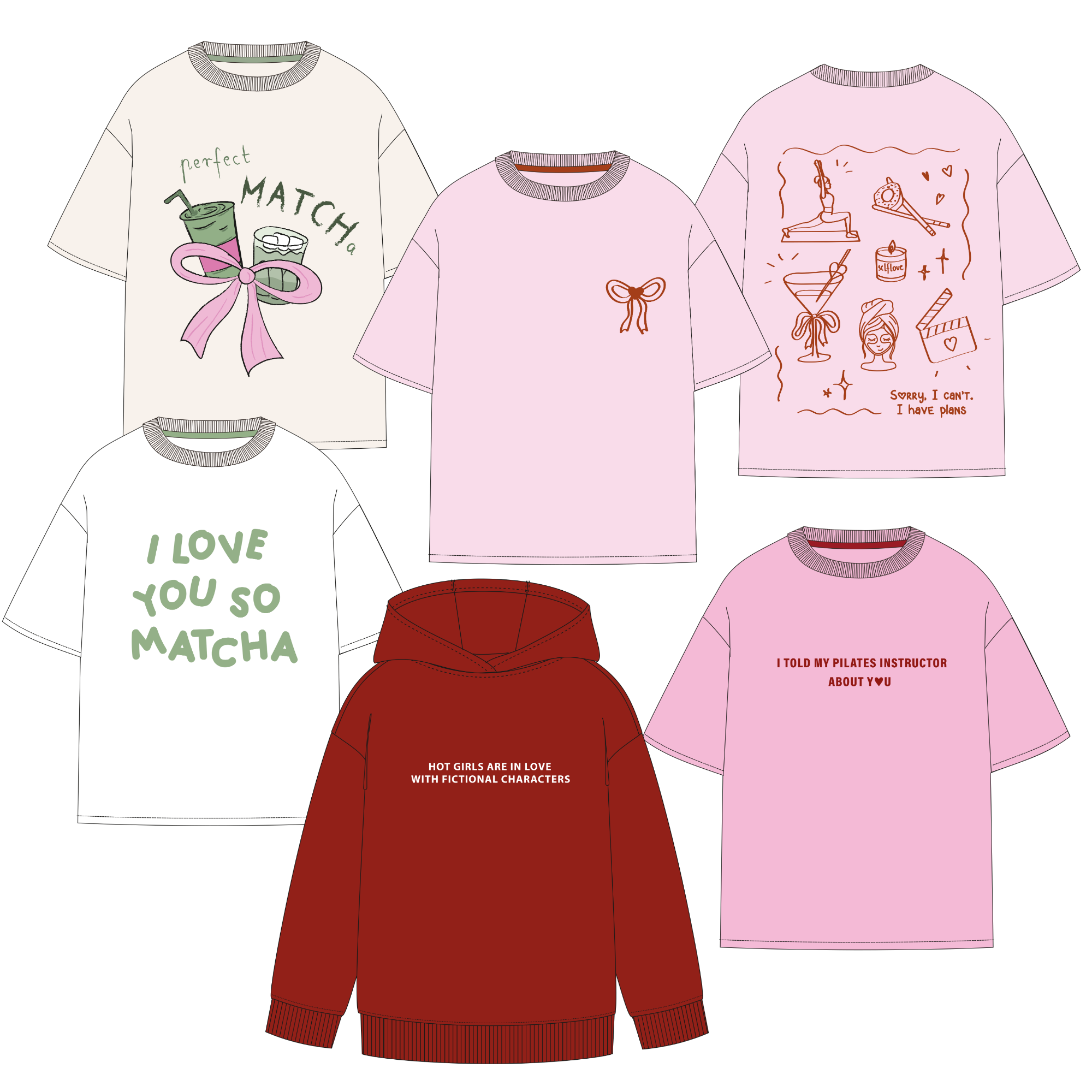 Pastelowe kolory, matcha-love hasła i rysunkowe ilustracje łączą romantyczny vibe z humorem i luzem.